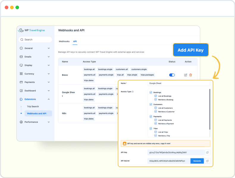Generate API keys to safely connect your travel site with tools like Google Sheets, email tools, or accounting software.